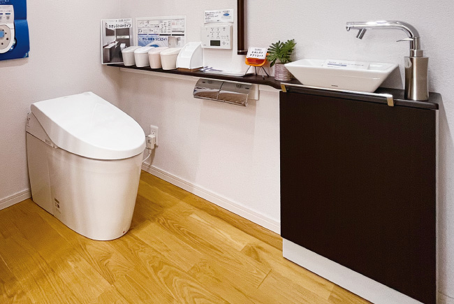 節水・省エネはもちろん、オート開閉や 停電時安心設計など嬉しい機能たっぷり。 洗面化粧台はお手入れしやすいボウル一体型、 メイク収納付など豊富なラインナップ。