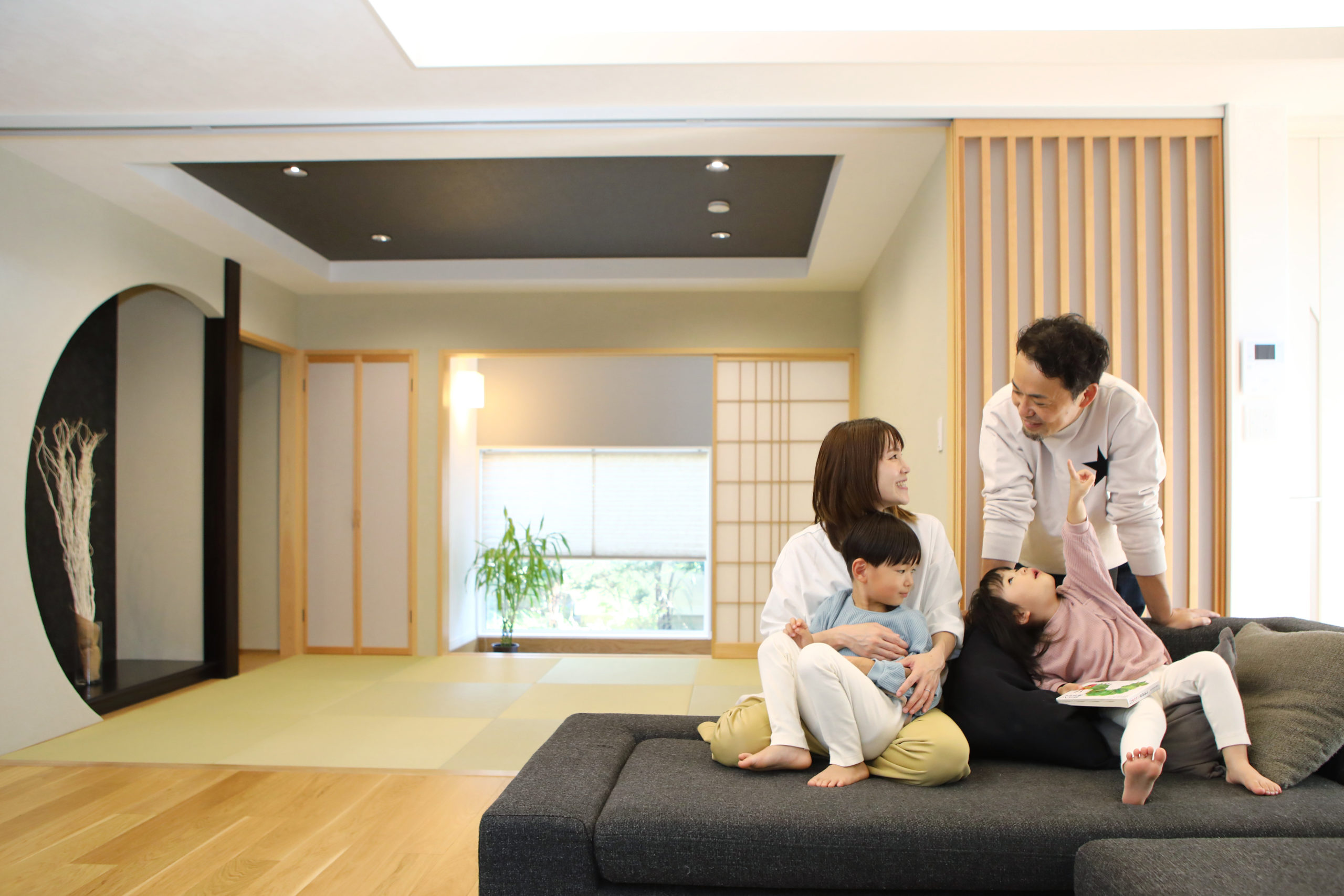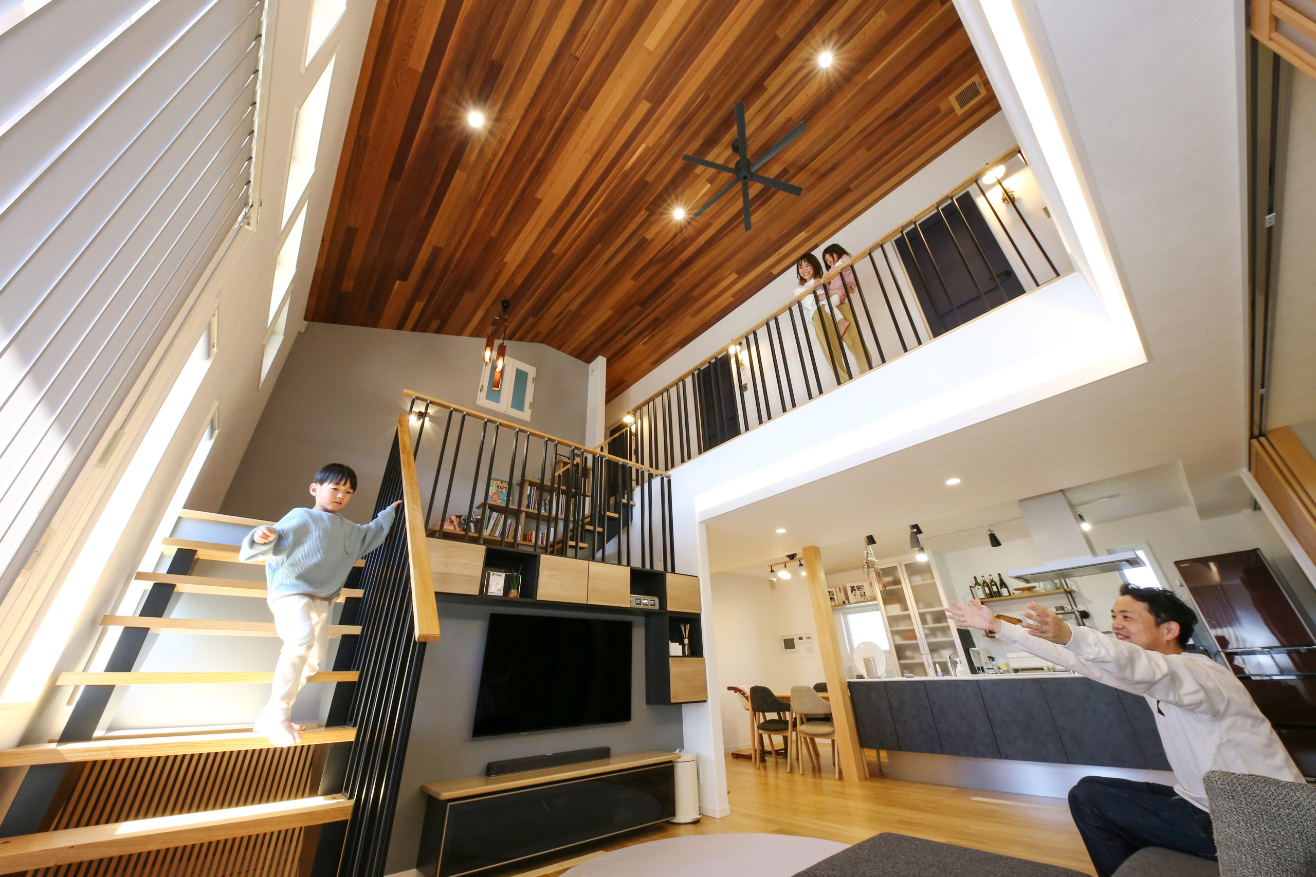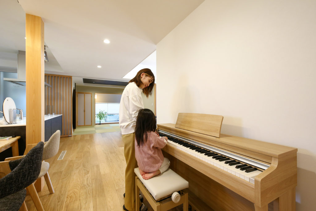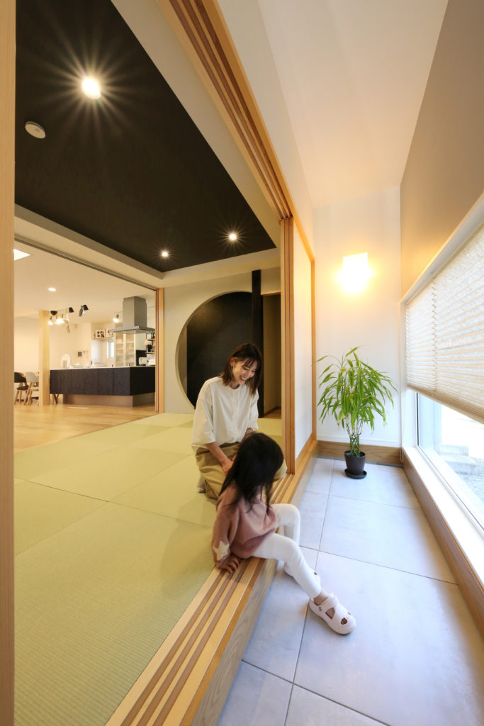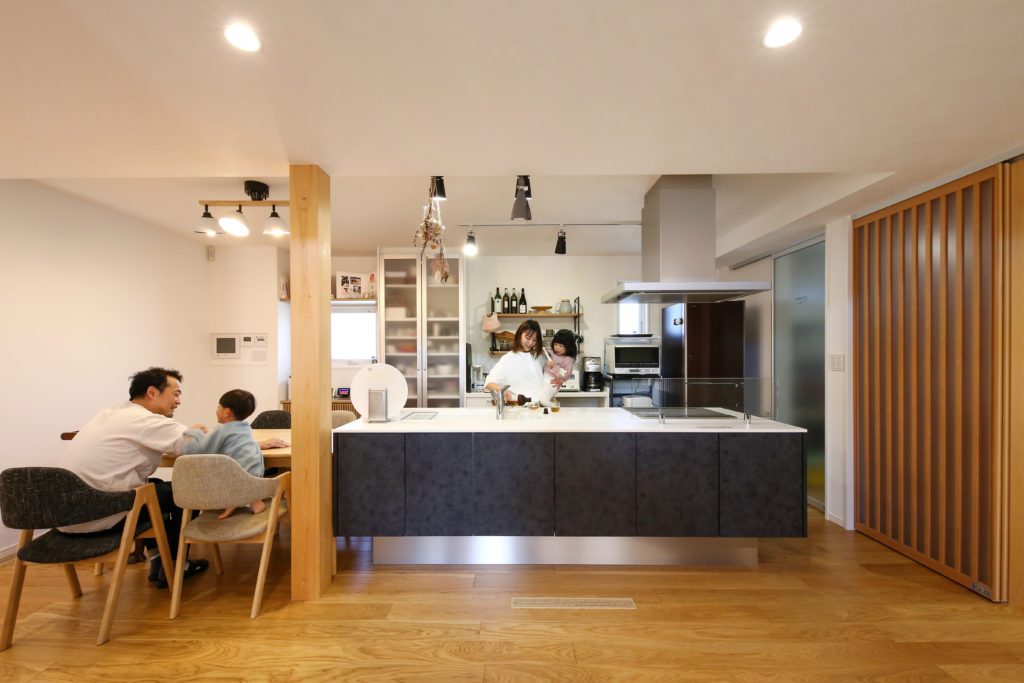 こだわった点はLDKの吹き抜けにこだわりました。スキップフロアでオープンな階段にし、天井はクロスではなく無垢の板張り、照明でアクセントを付けました。また、アイランド型キッチンにすることで子供たちが何してるのか顔を見ながら料理できるので良かったです。和室ではリビングと隣接し、床の間はRの壁に仕上げ、土間に出られる動線にもこだわりました。お家の家事動線も良く、バリアフリーなので子供たちが安心して遊べてお掃除も楽です。