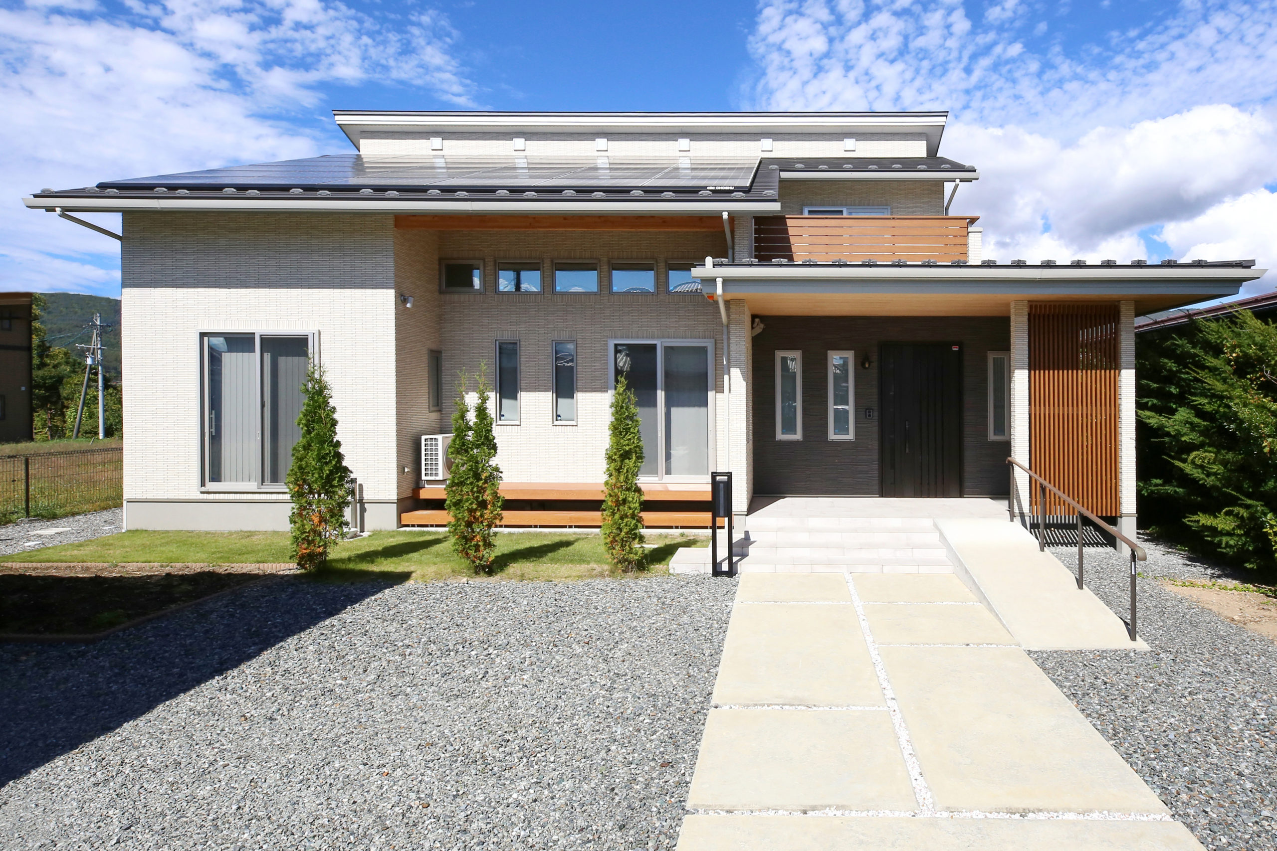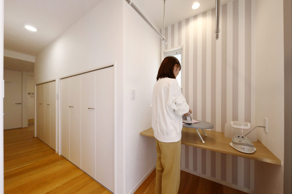 ランドリールームがすごくお気に入りです。洗濯物を干して畳んでアイロンがけが出来ての作業が一つの部屋でできるのは助かるので計画して良かったです。外観のアクセントで考えた玄関ポーチ部分もお気に入りです。また、エクステリアについても玄関ポーチへのスロープはベビーカーを押しながら、そのまま玄関まで行けたりしてとても便利です。のせたいと思っていた太陽光パネルもしっかり経済面で支えてくれています。LDKの吹き抜けの天井はクロスではなく無垢の板張りで立体感がある仕上がりになりこだわって良かったです。