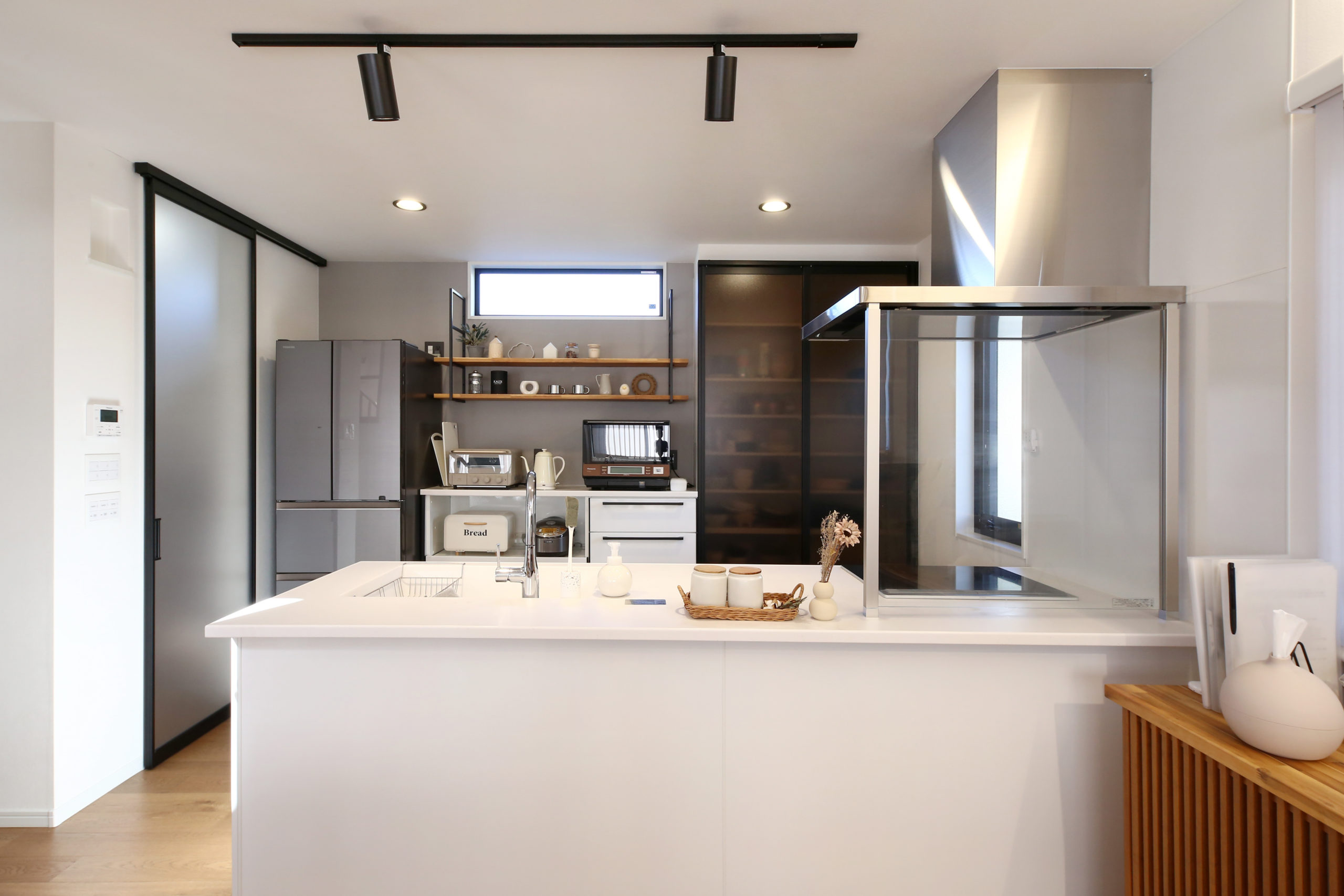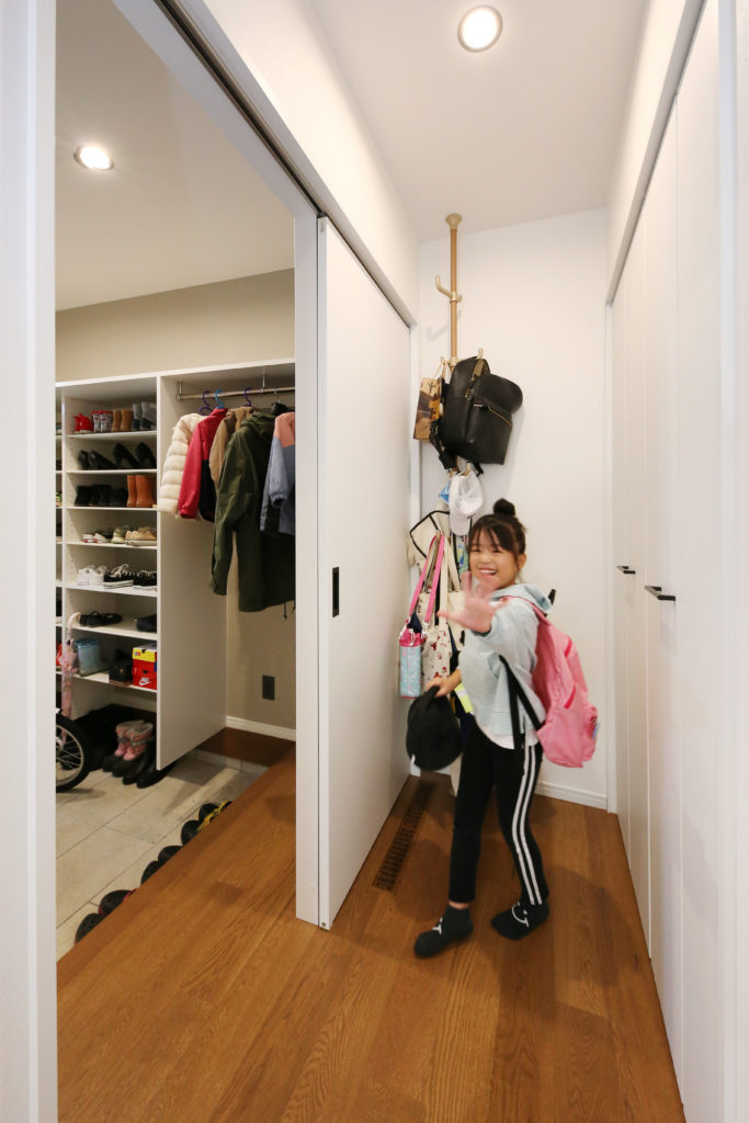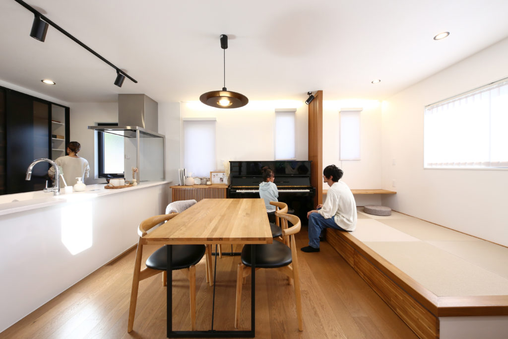 キッチンはフルフラット対面式キッチンにして、料理を作りながら家族とコミュニケーションが取れるのでとても使い勝手が良いです。他にも吹き抜け、小上がりの畳コーナー、広いシューズクロークなどがお気に入りポイントです。